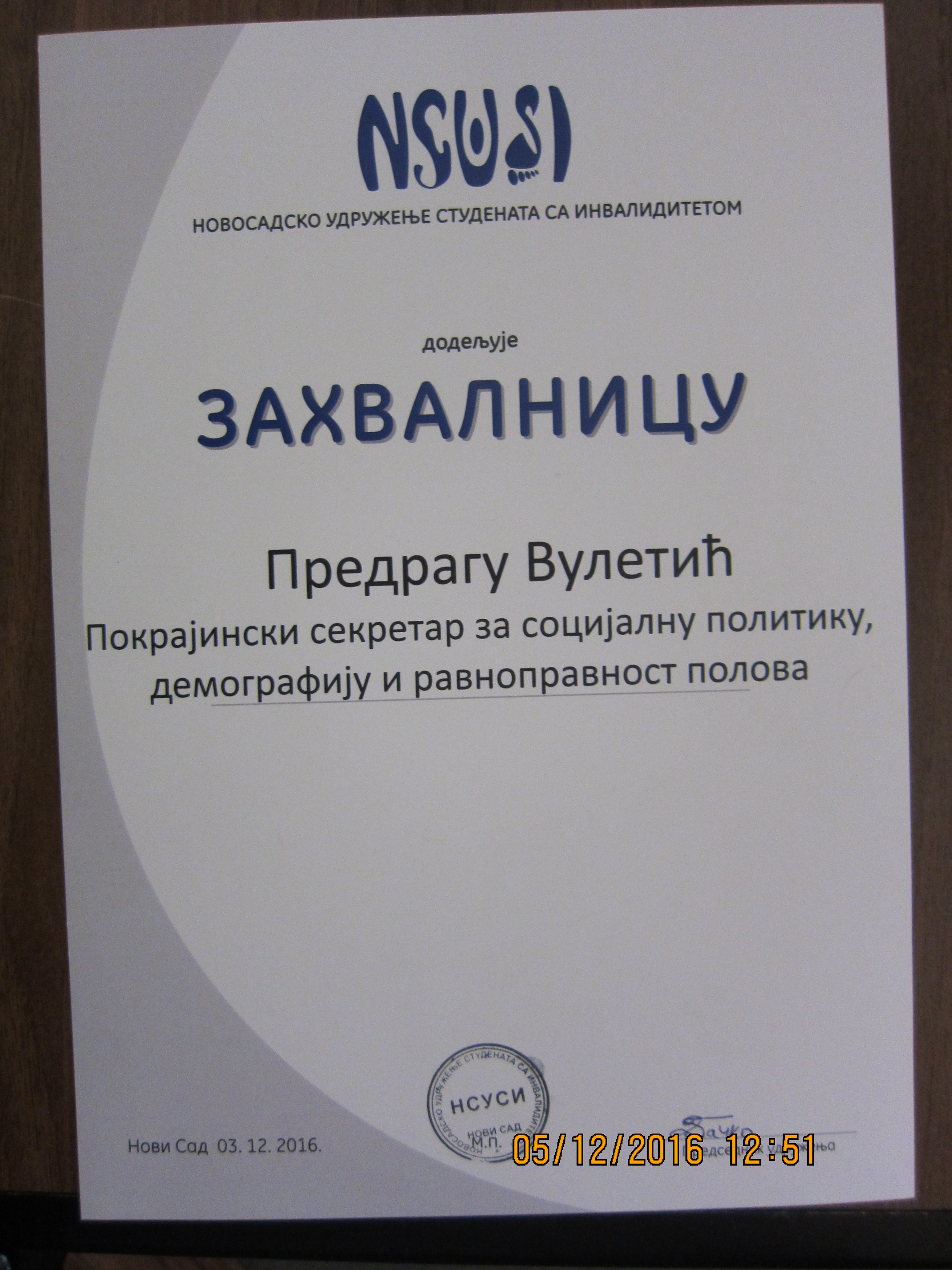 Новосадско удружење студената са инвалидитетом је у суботу, 3.децембра у просторијама Посланичког клуба Скупштине АП Војводине обележило Међународни дан особа са инвалидитетом и 15 година удружења.