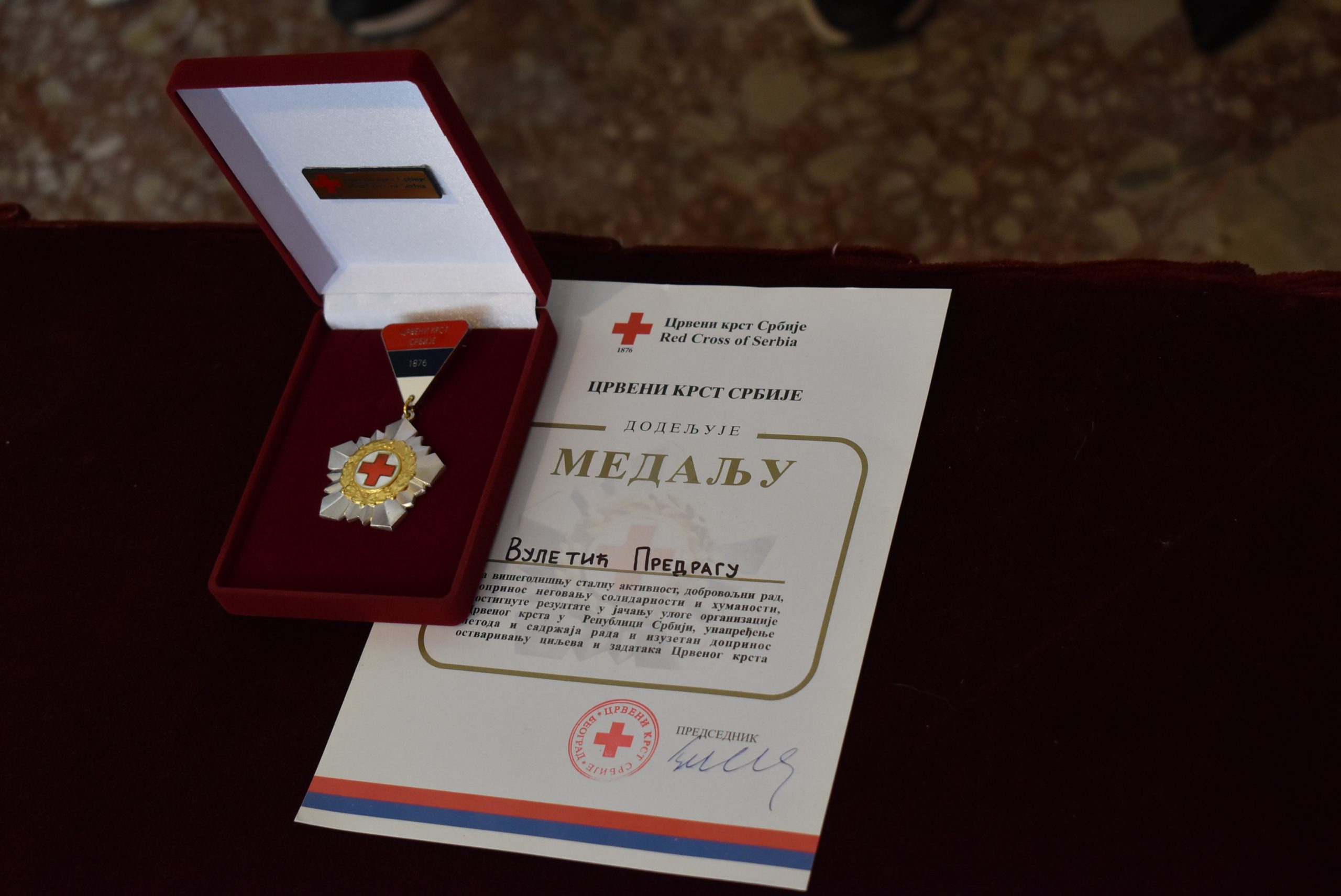 Рад Црвеног крста у великој мери зависи од подршке људи добре воље, који препознају важност, значај и улогу организације Црвеног крста у друштву. За несебичну подршку у раду и функционисању организације покрајинском секретару за социјалну политику, демографију и равноправност полова господину Предрагу Вулетићу урученa je медаља Црвеног крста.